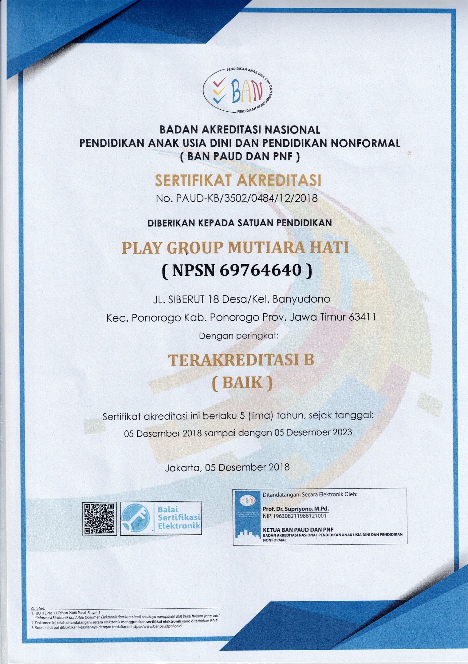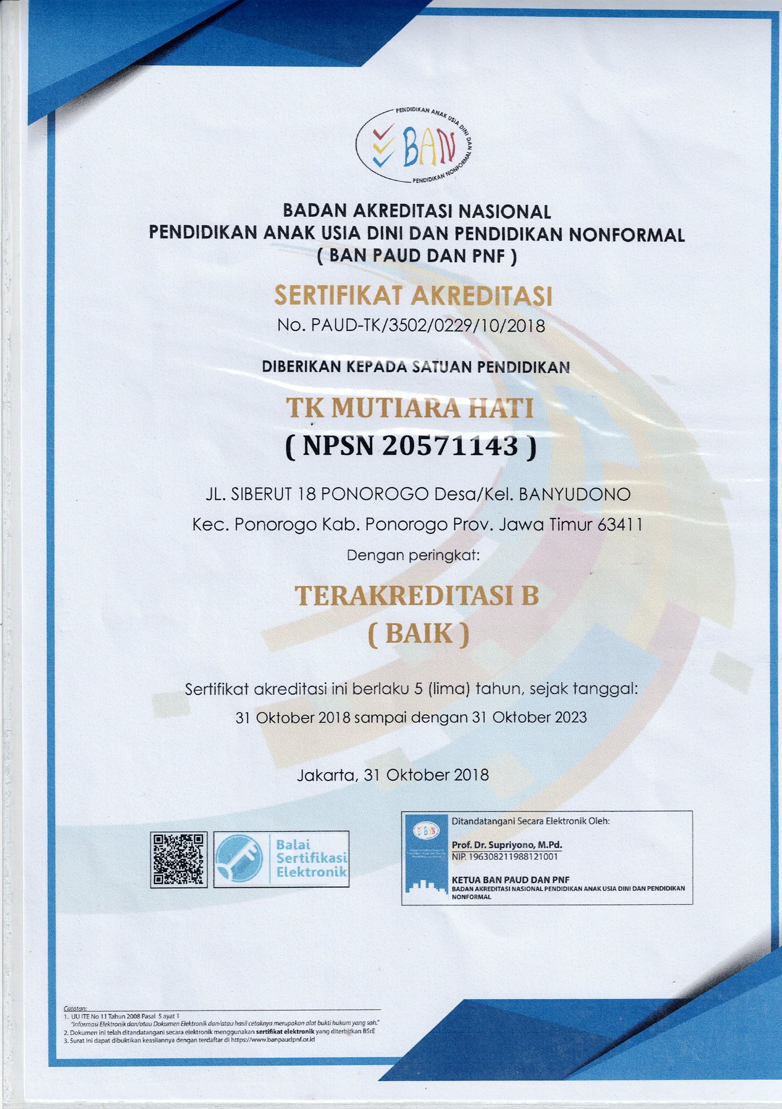 Mutiara Hati School memegang akreditasi resmi dari Badan Akreditasi Nasional (BAN), menegaskan kepatuhan kami pada standar kualitas pendidikan nasional. Untuk menjamin standar global, kami bermitra strategis dengan Mentari Group, partner resmi Cambridge Assessment English. Kerja sama ini memastikan kurikulum dan ujian Bahasa Inggris kami sesuai standar internasional, serta membekali guru kami dengan sertifikasi TKT Certified yang diakui secara global.